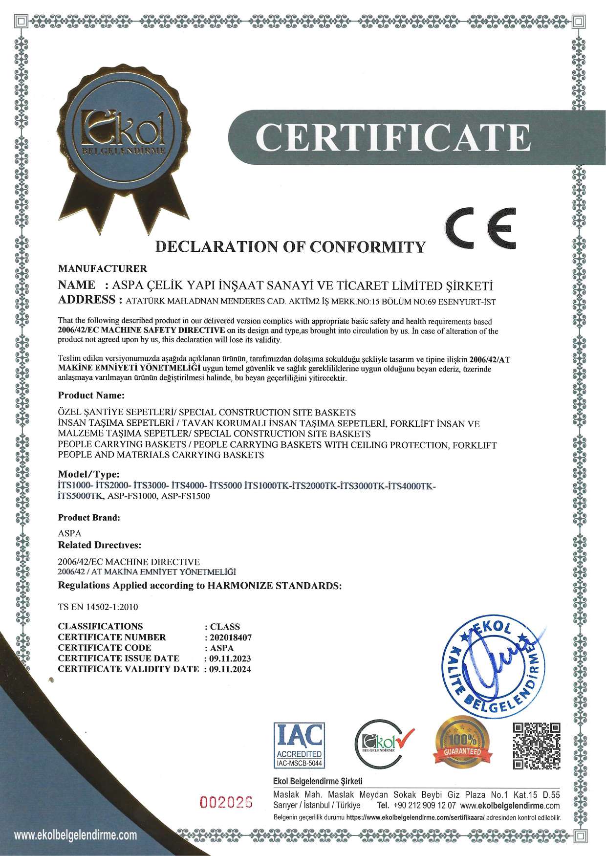 • İnsan Taşıma ve Çalışma Sepetleri “TS EN 14502-1:2010” standartlarına uygun olarak imal edilmektedir.
